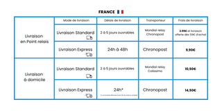 Mondial Relay, Colissimo et Chronopost. Les commandes sont expédiées sous 2 jours ouvrés